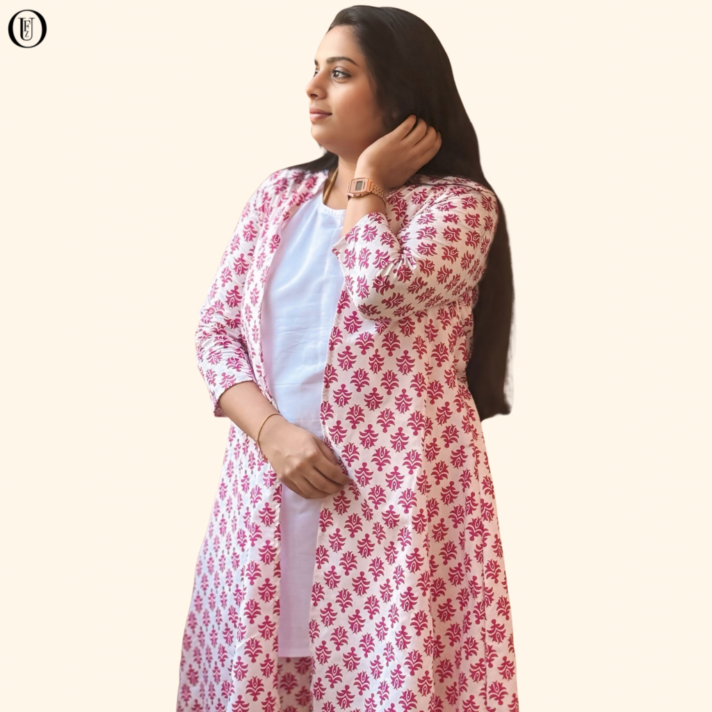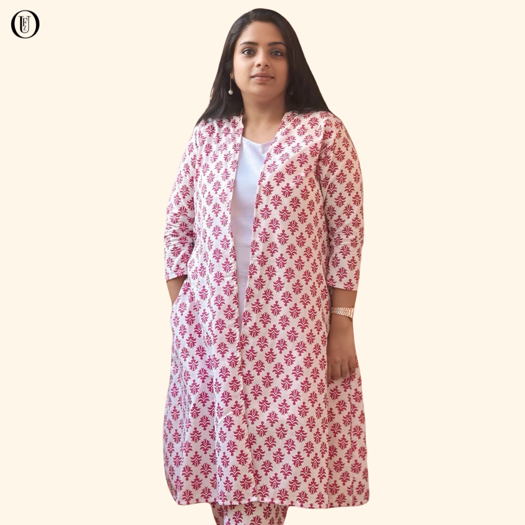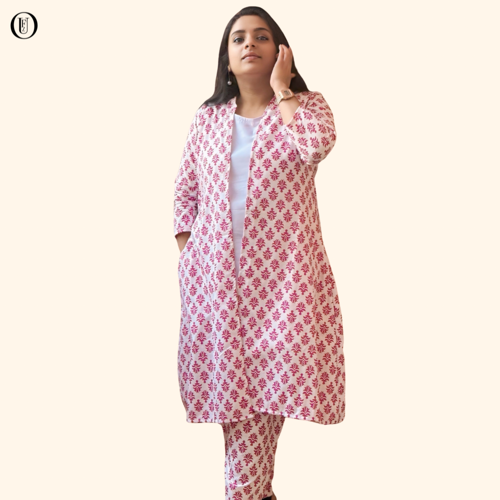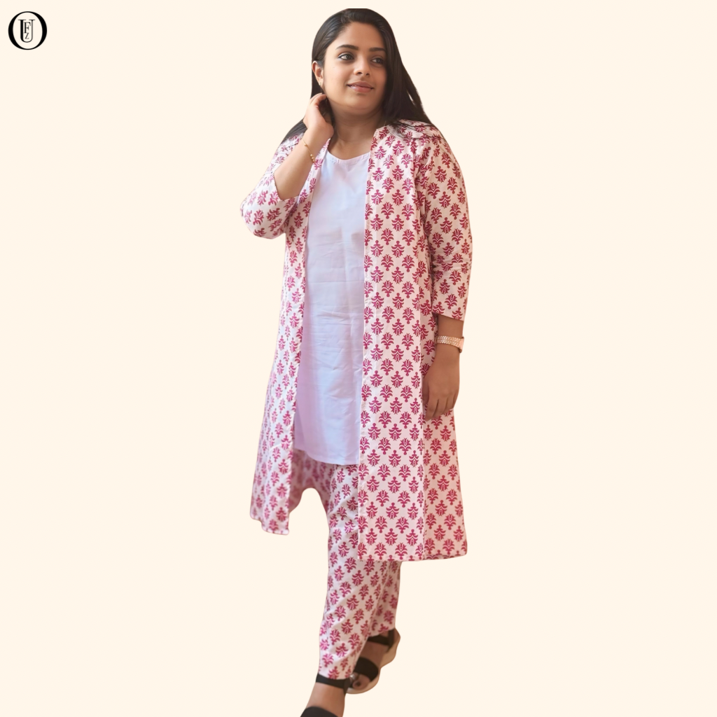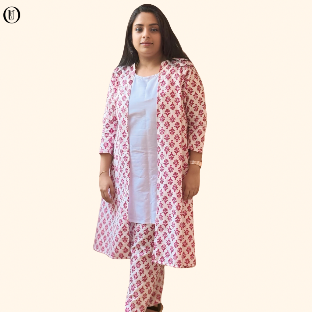 A stylish three-piece set in a soft blush pink shade, crafted from a comfortable cotton blend fabric. It features a printed longline coat with delicate floral motifs, paired with matching straight-fit pants and a light, solid inner top. The breathable material and elegant design make it perfect for casual outings or relaxed festive wear.